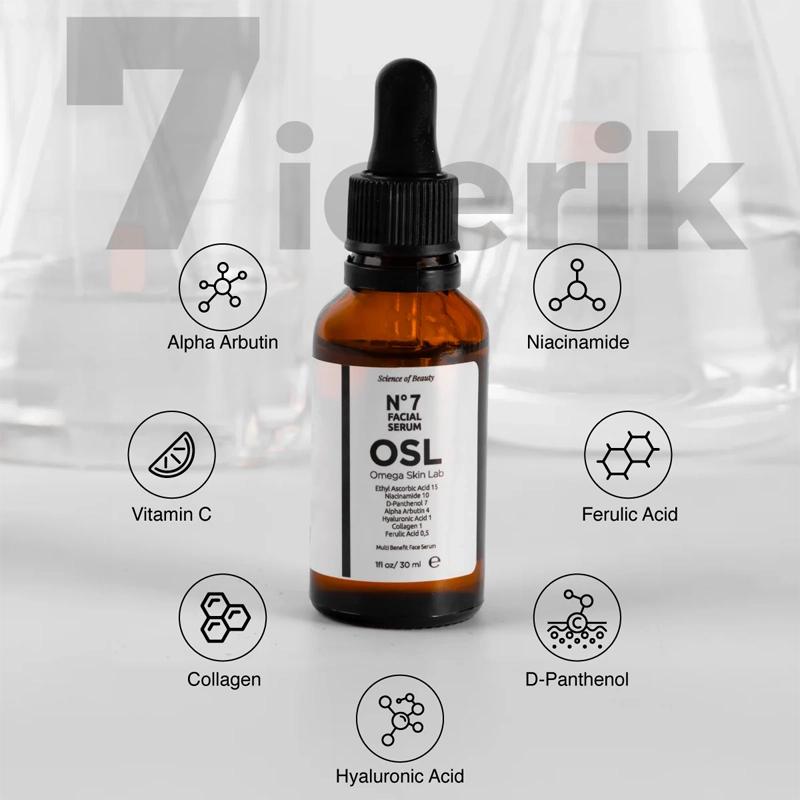 OSL No 7 Facial Serum, 7 güçlü aktif bileşenle ince çizgileri azaltır, cilt tonunu eşitler ve daha canlı bir görünüm sağlar. Tüm cilt tipleri için 30 ml.