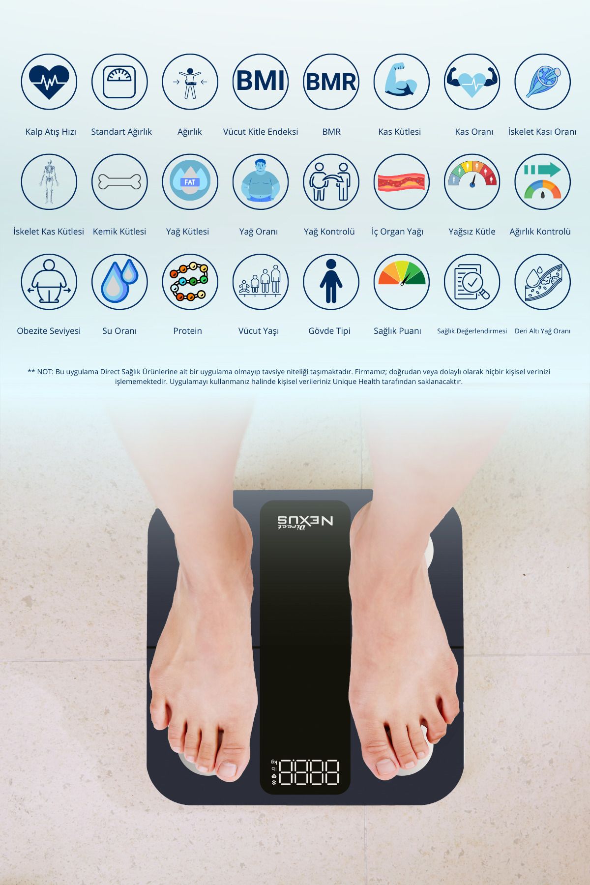 - 1 yıl resmi distribütör garantisi ile güvenle kullanın.; - Net ve kolay okunabilirlik için LCD ekran özelliği.; - Akıllı telefon uygulaması üzerinden kontrol edilebilirlik, her an her yerden erişilebilirlik sağlar.; - Şık siyah renk tasarımı, modern mutfak dekorasyonlarına uyum sağlar.; - Dayanıklı cam materyal kullanımı, uzun ömürlü ve estetik bir görünüm sunar.; - Bluetooth bağlantısı sayesinde kablosuz veri aktarımı ve senkronizasyon kolaylığı.; - Vücut Kitle İndeksi (BMI) ölçümü ile sağlıklı yaşam hedeflerinize ulaşmanızda yardımcı olur.; - Bazal Metabolizma Hızı ölçümü ile günlük enerji ihtiyacınızı belirleyerek beslenme planınızı optimize edin.; - Vücut Su Oranı ölçümü ile hidrasyon seviyenizi takip ederek sağlıklı bir yaşam sürdürün.