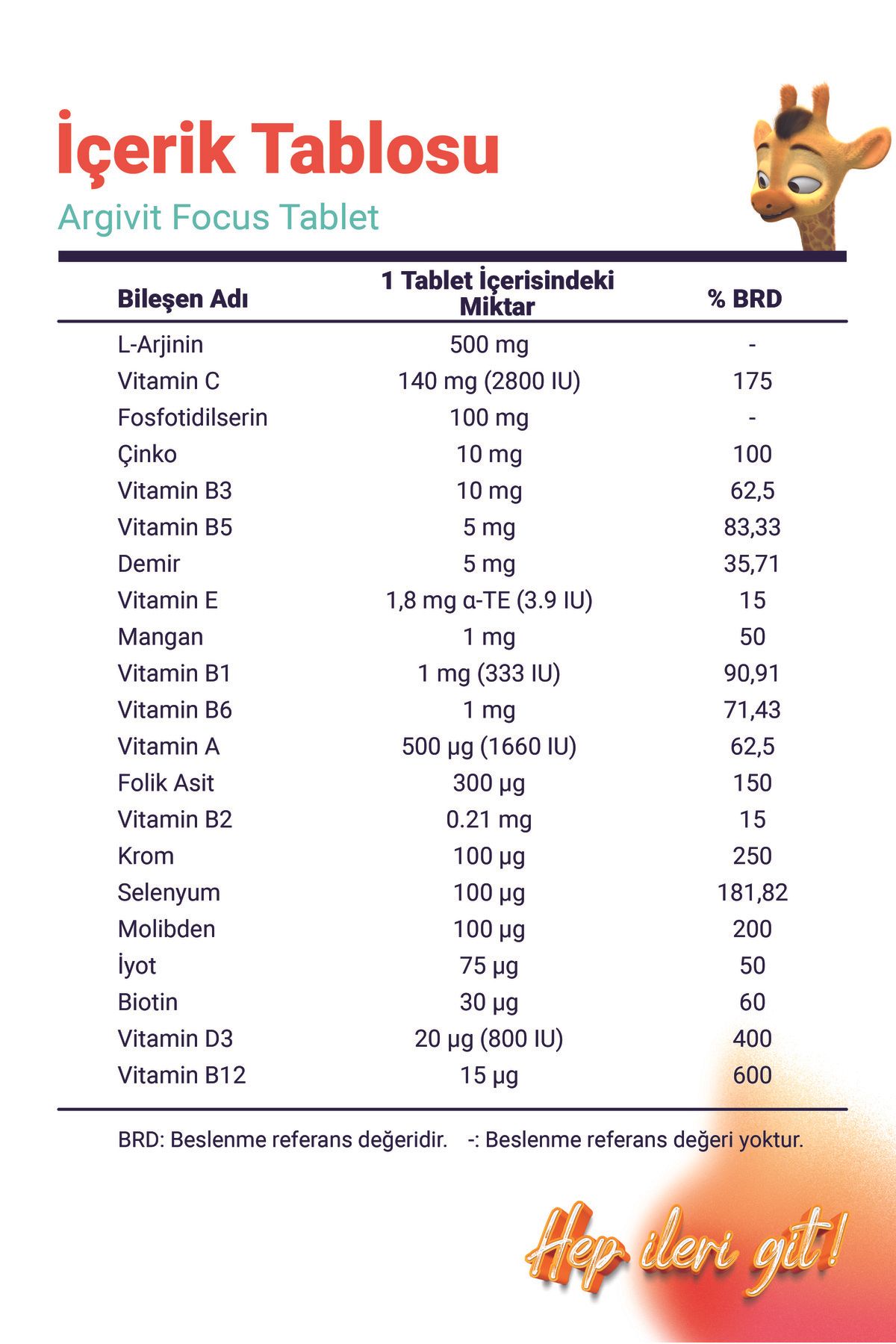 Argivit Focus Fosfatidilserin, L-Arjinin, Multivitamin ve Multimineral Tablet 30 Adet ;Gluten İçermez ; Helal Ürün Sertifikalı ; Vegan Sertifikalı ; İçindekiler : Multivitamin, Multimineral, L-Arjinin, Vitamin C, Fosfoditilserin, Vitamin B3, Çinko, Vitamin B5, Vitamin B1 (Tiamin), Vitamin B2, Vitamin E, Manganez, Vitamin B6, Vitamin A, Folik asit, İyot, Krom, Selenyum, Molibden, Biyotin, Vitamin D, Vitamin B12 (Metilkobalamin) ; Tavsiye Edilen Günlük Alım Dozu : 11 yaş ve üzeri yetişkinlerin günde 1 defa 1 tablet, tercihen tok karnına kullanması tavsiye edilir.; ; Kullanıcı Grubu : 11 yaş ve üzeri yetişkinlerin kullanması tavsiye edilir.; ; Uyarılar: Hamilelik veya emzirme döneminde doktorunuza danışarak kullanınız.; Takviye edici gıdalar normal beslenmenin yerine geçemez.; Çocukların ulaşamayacağı yerde saklayınız.; ; Tavsiye Edilen Tüketim Tarihi (TETT) ve Parti No ambalajın üzerinde yer almaktadır.; İlaç değildir.; Hastalıkların önlenmesi veya tedavi edilmesi amacıyla kullanılmaz.; ; Muhafaza Koşulları: Ürün orijinal ambalajında 25°C’nin altında kuru bir yerde saklanmalıdır.; Açıldıktan sonra altı ay içerisinde tüketilmesi önerilmektedir.