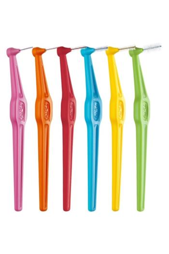 TePe Angle diş arası fırçalar, açılı başlık ve uzun, düz sap tasarımı sayesinde arkadaki dişlerin arasına bile erişimi kolaylaştırır. Her bir fırça farklı boyutlarda (ISO 0-5) renklendirilmiş olup çeşitli diş aralıklarına uygun temizlik sağlar.